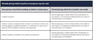 Generally, if a person becomes bankrupt on either a creditor’s petition or a debtor’s petition, a transfer of property by the bankrupt that constitutes a preference is voidable if it occurred within the six months immediately preceding the presentation of the petition.