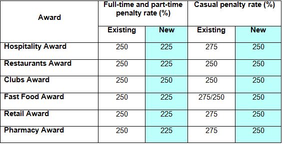 • Public holiday penalty rates will be reduced as set out in the following table: